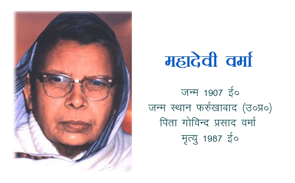 महादेवी वर्मा (26 मार्च 1907 — 11 सितंबर 1987) हिन्दी की सर्वाधिक प्रतिभावान कवयित्रियों में से हैं। वे हिन्दी साहित्य में छायावादी युग के चार प्रमुख स्तंभों[क] में से एक मानी जाती हैं। आधुनिक हिन्दी की सबसे सशक्त कवयित्रियों में से एक होने के कारण उन्हें आधुनिक मीरा के नाम से भी जाना जाता है।कवि निराला ने उन्हें “हिन्दी के विशाल मन्दिर की सरस्वती” भी कहा है।महादेवी ने स्वतंत्रता के पहले का भारत भी देखा और उसके बाद का भी। वे उन कवियों में से एक हैं जिन्होंने व्यापक समाज में काम करते हुए भारत के भीतर विद्यमान हाहाकार, रुदन को देखा, परखा और करुण होकर अन्धकार को दूर करने वाली दृष्टि देने की कोशिश की।न केवल उनका काव्य बल्कि उनके सामाजसुधार के कार्य और महिलाओं के प्रति चेतना भावना भी इस दृष्टि से प्रभावित रहे। उन्होंने मन की पीड़ा को इतने स्नेह और शृंगार से सजाया कि दीपशिखा में वह जन-जन की पीड़ा के रूप में स्थापित हुई और उसने केवल पाठकों को ही नहीं समीक्षकों को भी गहराई तक प्रभावित किया।